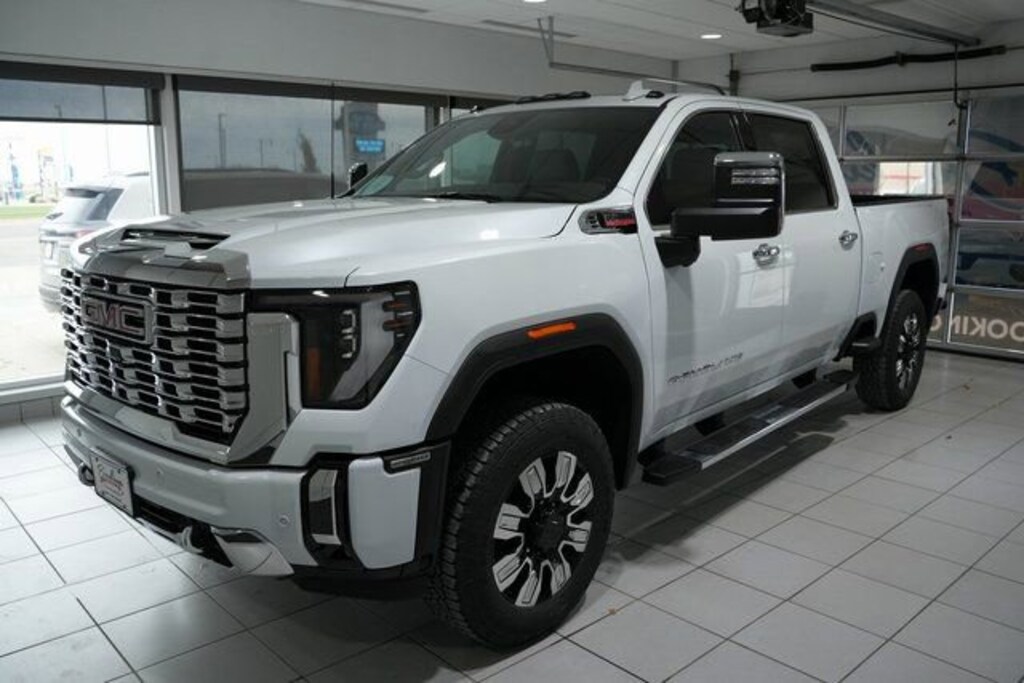 Glacier White Tricoat 2026 GMC Sierra 2500HD Denali 4WD 10-Speed Automatic Duramax 6.6L V8 Turbodiesel 10-Speed Automatic, 4WD, Atmosphere/Brownstone Leather.